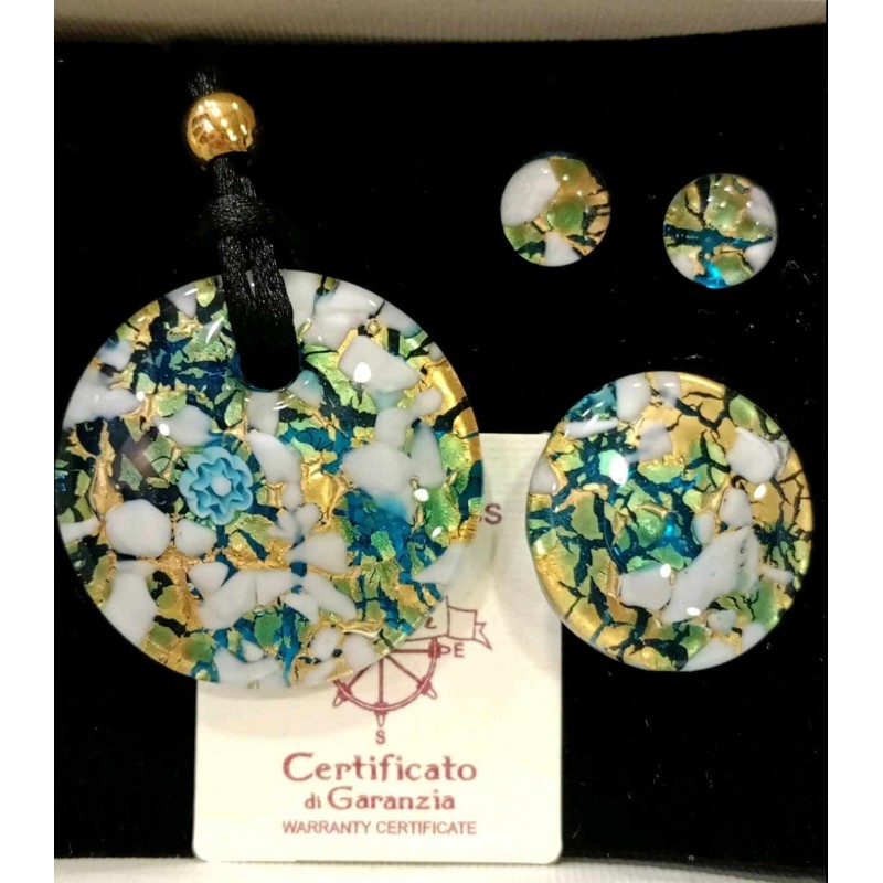 Комплект от оригинално Муранско стъкло! Диаметър на Колието 4 см, обици 1см, регулируем пръстен 2,5 см. Придружен със сертификат и подаръчна опаковка.