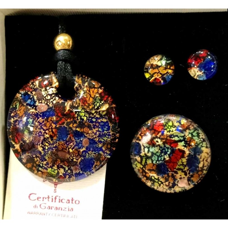 Комплект от оригинално Муранско стъкло! Диаметър на Колието 4 см, обици 1см, регулируем пръстен 2,5 см. Придружен със сертификат и подаръчна опаковка.