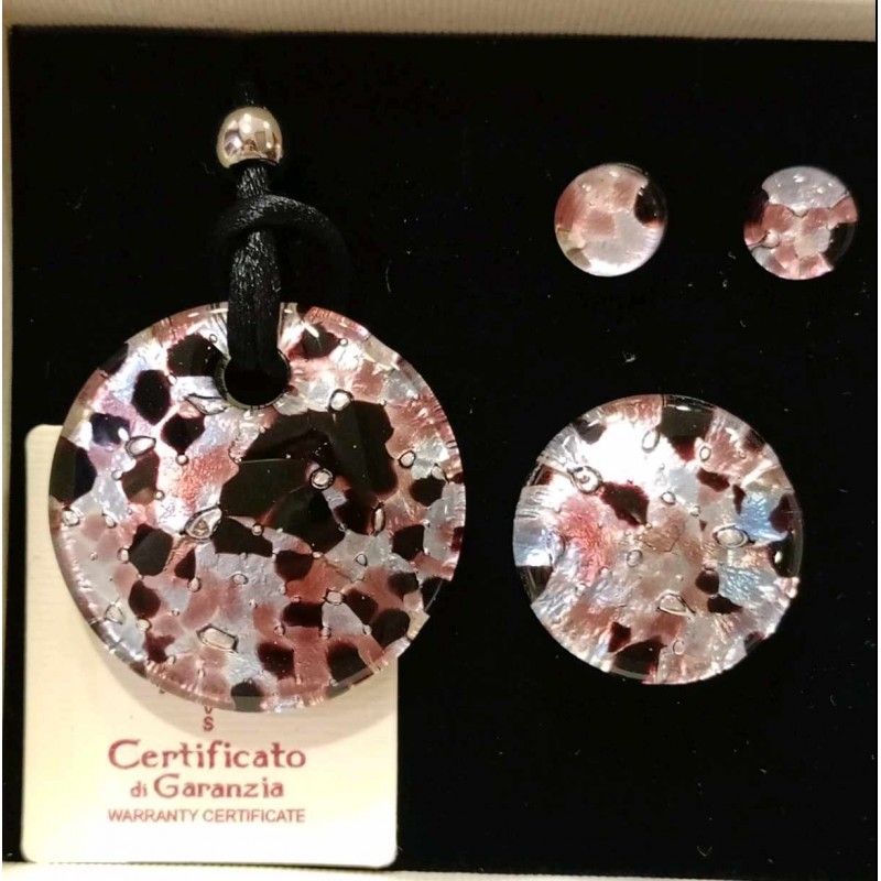 Комплект от оригинално Муранско стъкло! Диаметър на Колието 4 см, обици 1см, регулируем пръстен 2,5 см. Придружен със сертификат и подаръчна опаковка.
