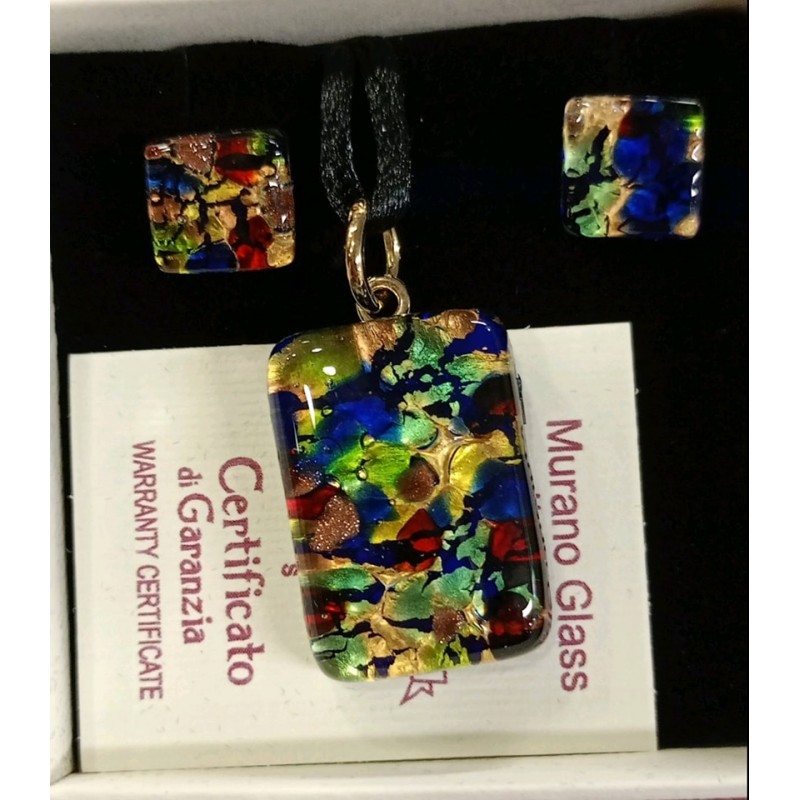 Комплект от оригинално Муранско стъкло! Размер на колието 2,5х1,7см,размер на обиците 1х1см! Придружен със сертификат и оригинална кутия