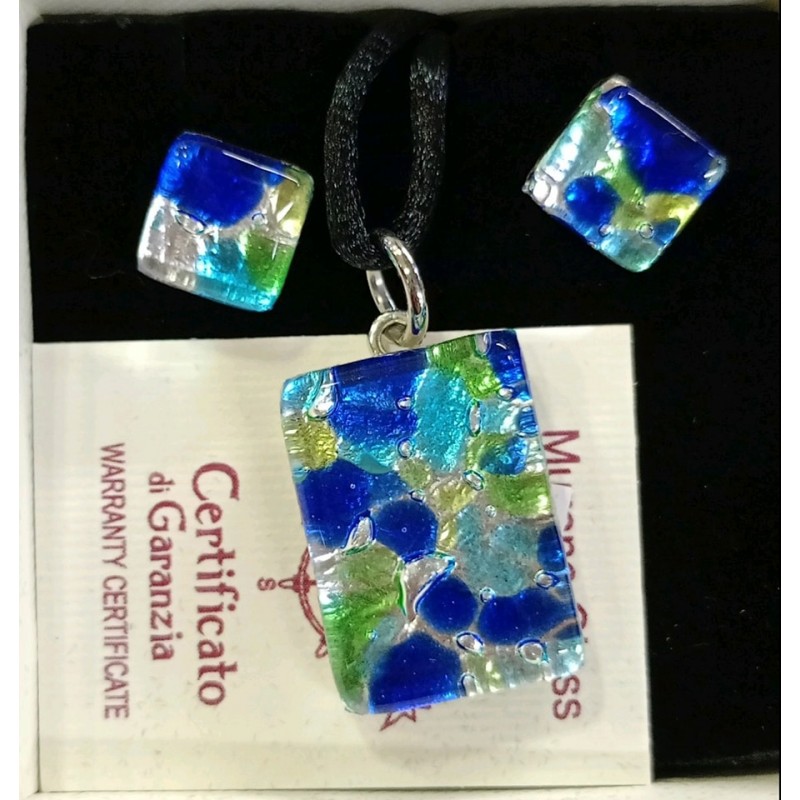 Комплект от оригинално Муранско стъкло! Размер на колието 2,5х1,7см,размер на обиците 1х1см! Придружен със сертификат и оригинална кутия