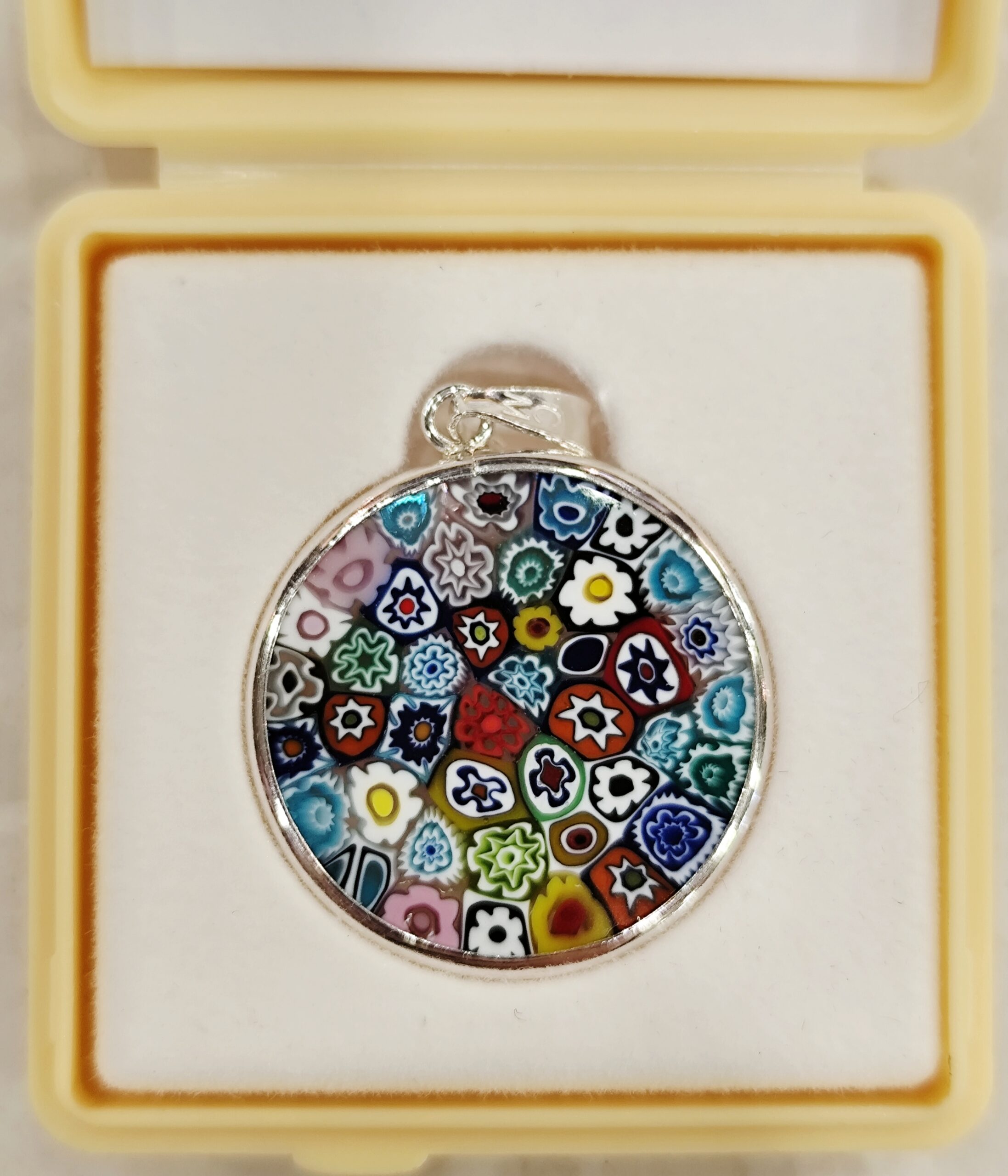 Медальон Мурина от Оригинално Муранско Стъкло! Сребърен обков, проба 925. Диаметър 23мм. Придружен със Сертификат и подаръчна опаковка.