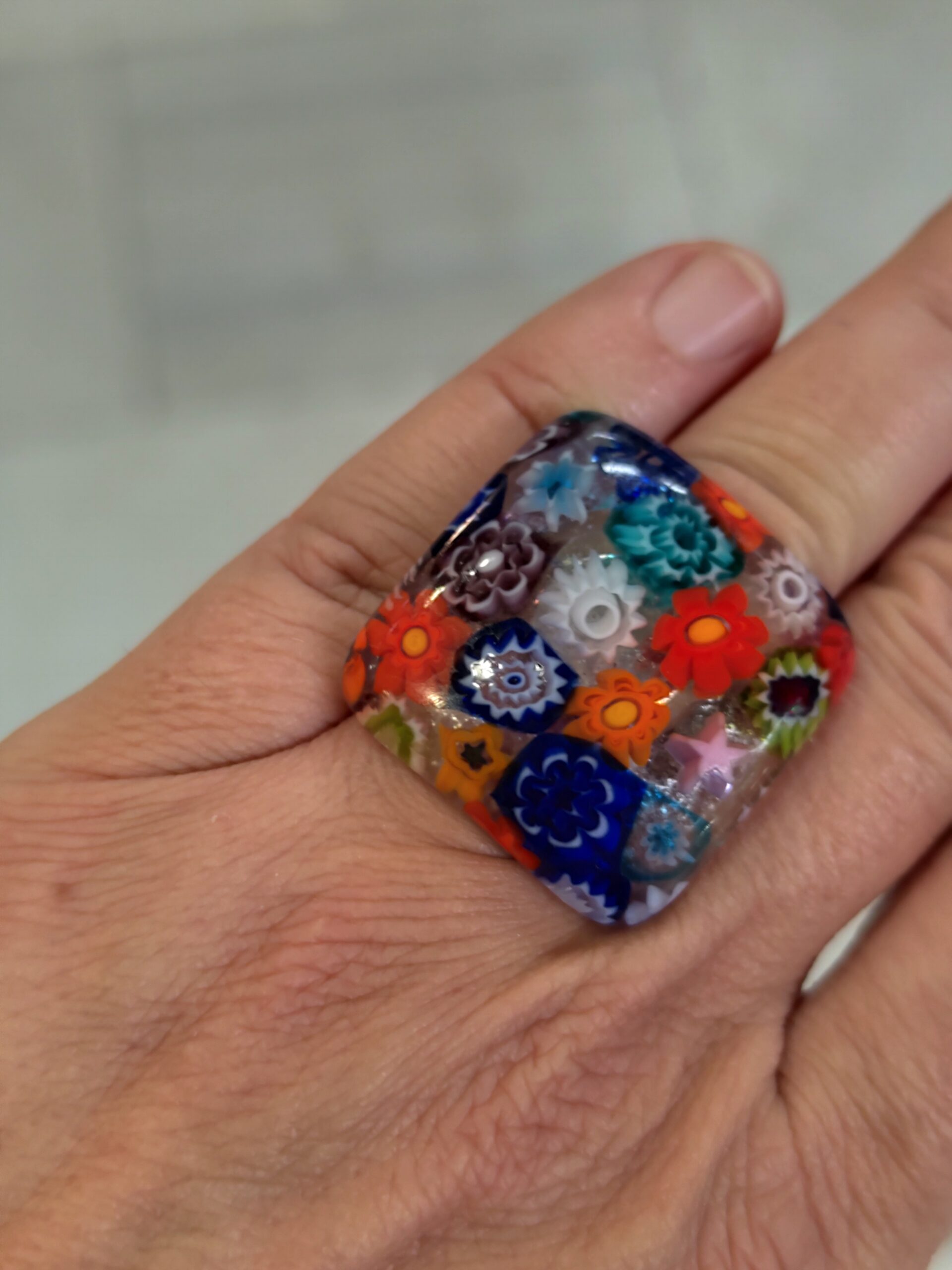 Пръстен с Оригинално Муранско стъкло.Регулиращ се размер.Плочка 2,5Х2,5см. Придружен със Сертификат и подаръчна опаковка