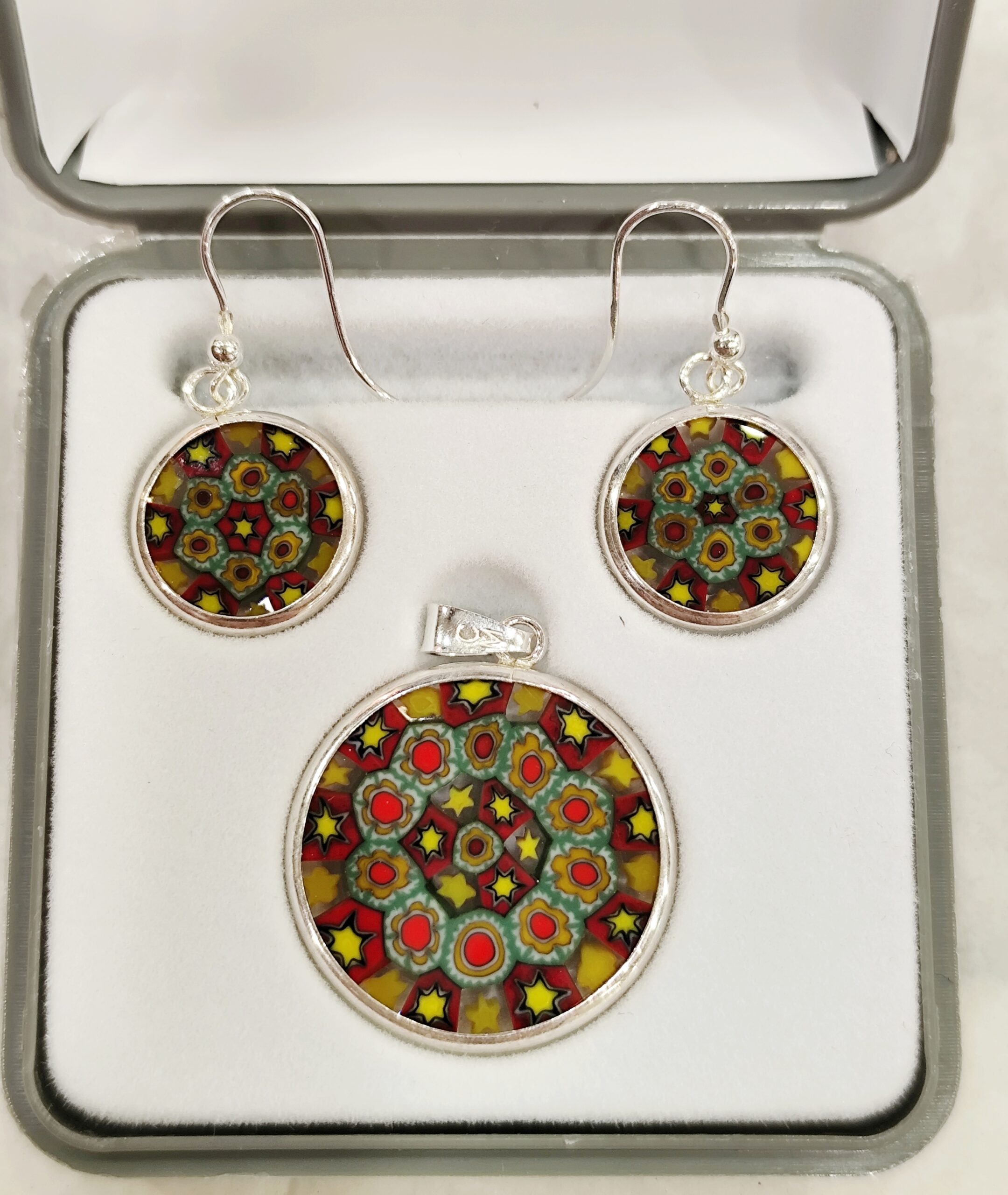 Комплект Медальон и Обеци от Оригинално Муранско стъкло Мурина. Диаметър на Медальона 23мм, диаметър на обеците 14мм. Сребърен обков, проба 925. Придружен със Сертификат и подаръчна опаковка.